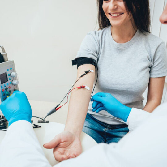 Elektromiyografi testi kaslarda üretilen küçük elektrik deşarjlarının seviyelerini ölçer. Bu test sürecinde doktor kaslar kasıldığında ve dinlendiğinde değişen elektriksel aktiviteyi değerlendirmek için bireyin belirli kaslarına iğne inceliğinde elektrotları yerleştirir. Bu test, hem median sinir tarafından kontrol edilen kaslara verilen hasarı tanımlayabilir hem de olası diğer koşulların varlığı ihtimalini ortadan kaldırabilir.
